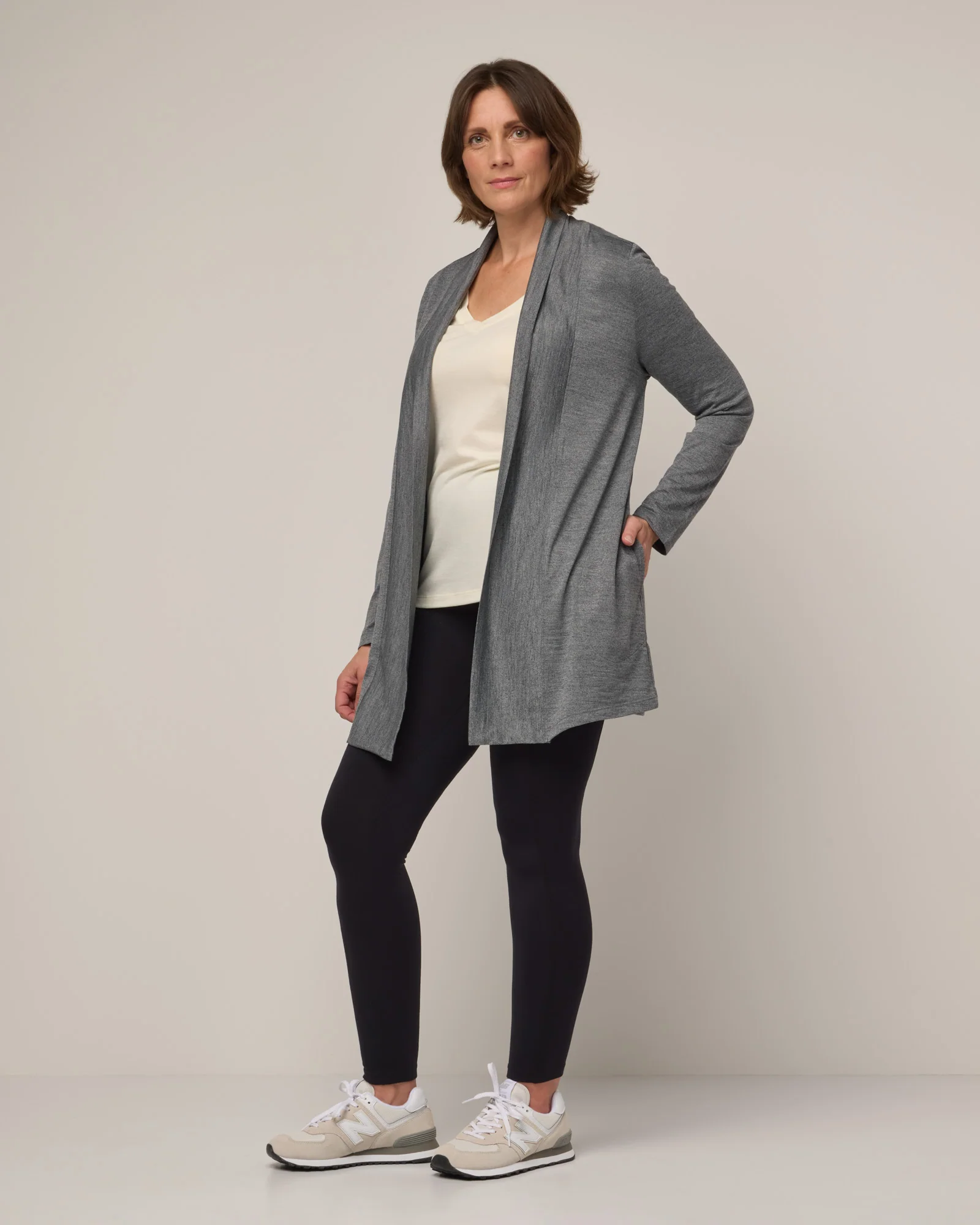 A lightweight, flowy cardigan. Designed for layering and year-round use. Features patch pockets, long sleeves, and hits you at mid-thigh.