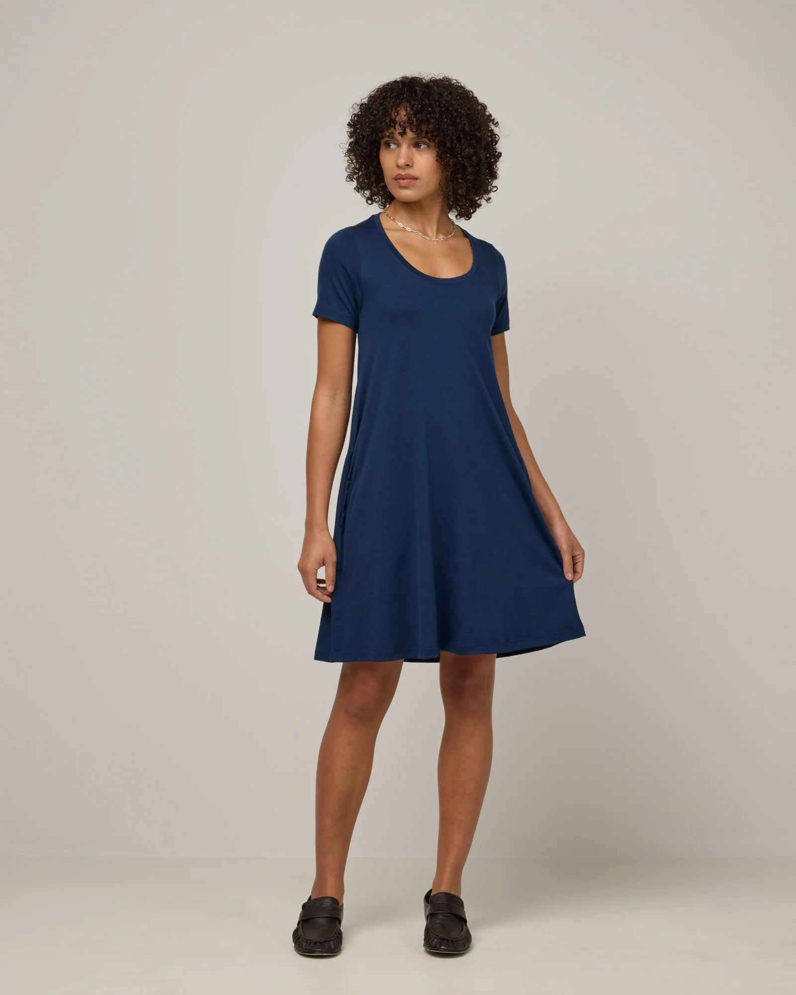 A swing dress with a slimmer cut, short sleeves, and a scoop neck. Pocketed and pairs well with just about everything.