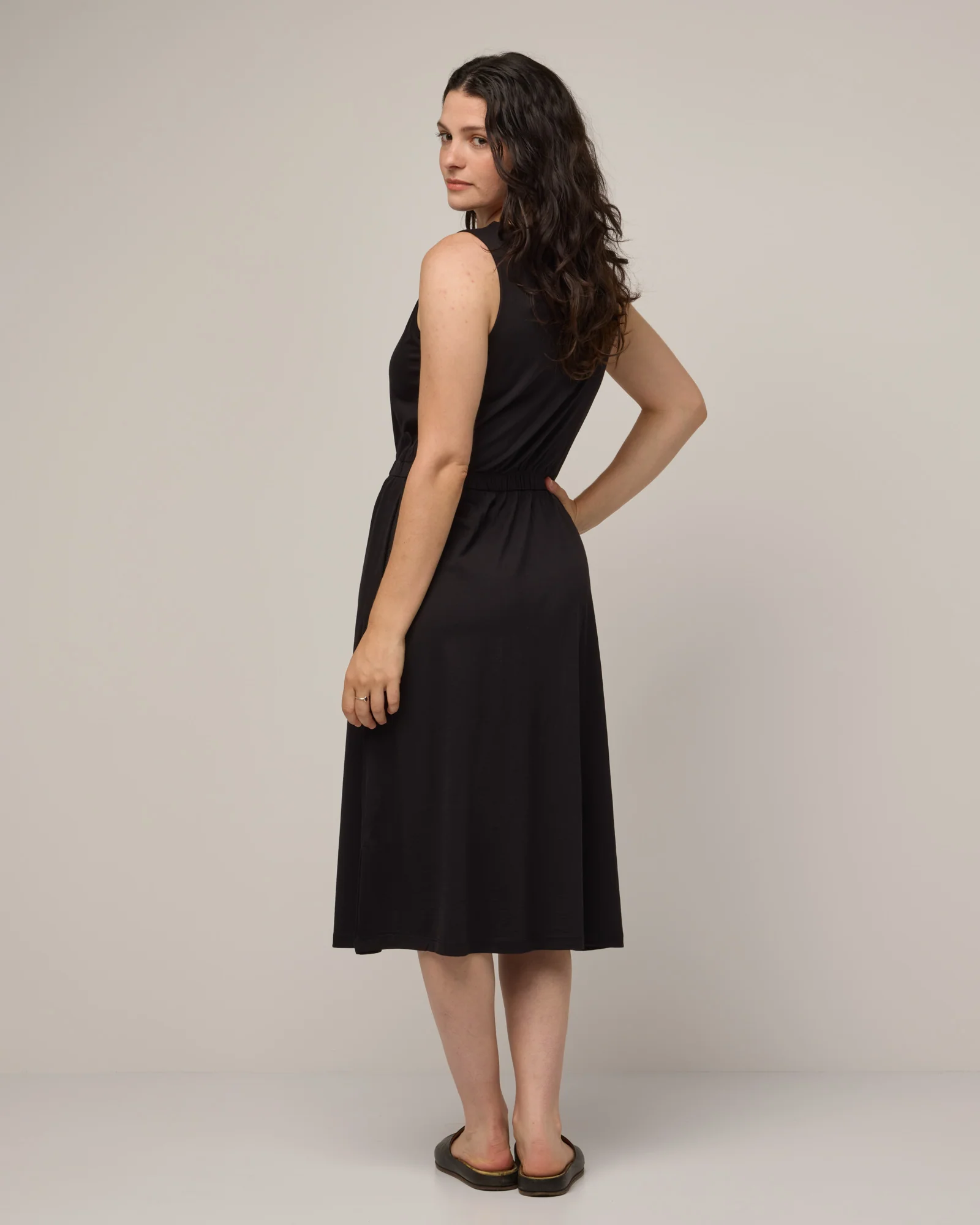This sleeveless high crew neck dress with pockets is made with our supersoft jersey for a flowy drape. The Sofia loves to be worn year-round—on its own or with layers.