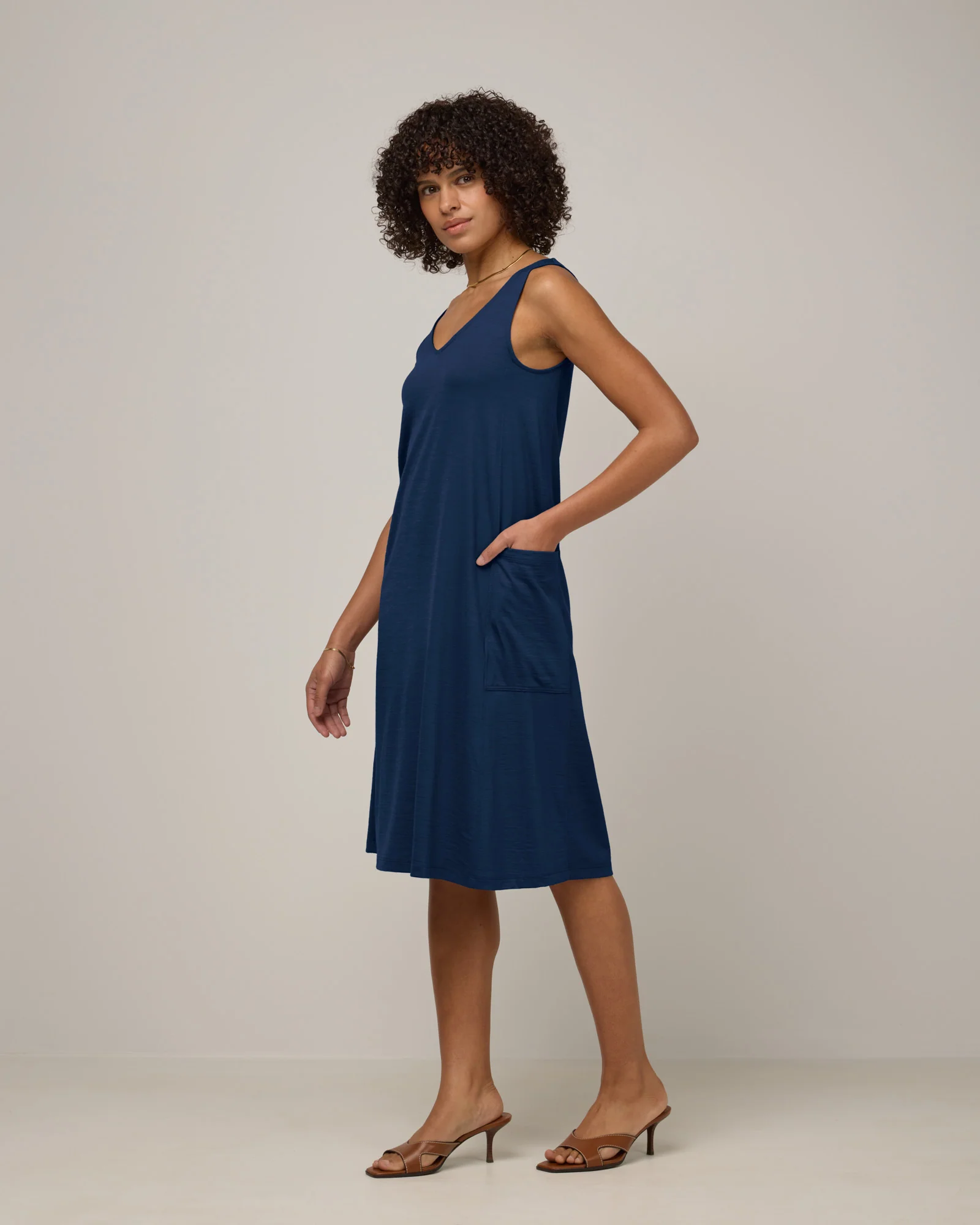 This semi-fitted, sleeveless dress can be worn as a crew neck or v-neck, belted or non-belted. A simple silhouette that hits just below the knee makes for an easy, everyday style.