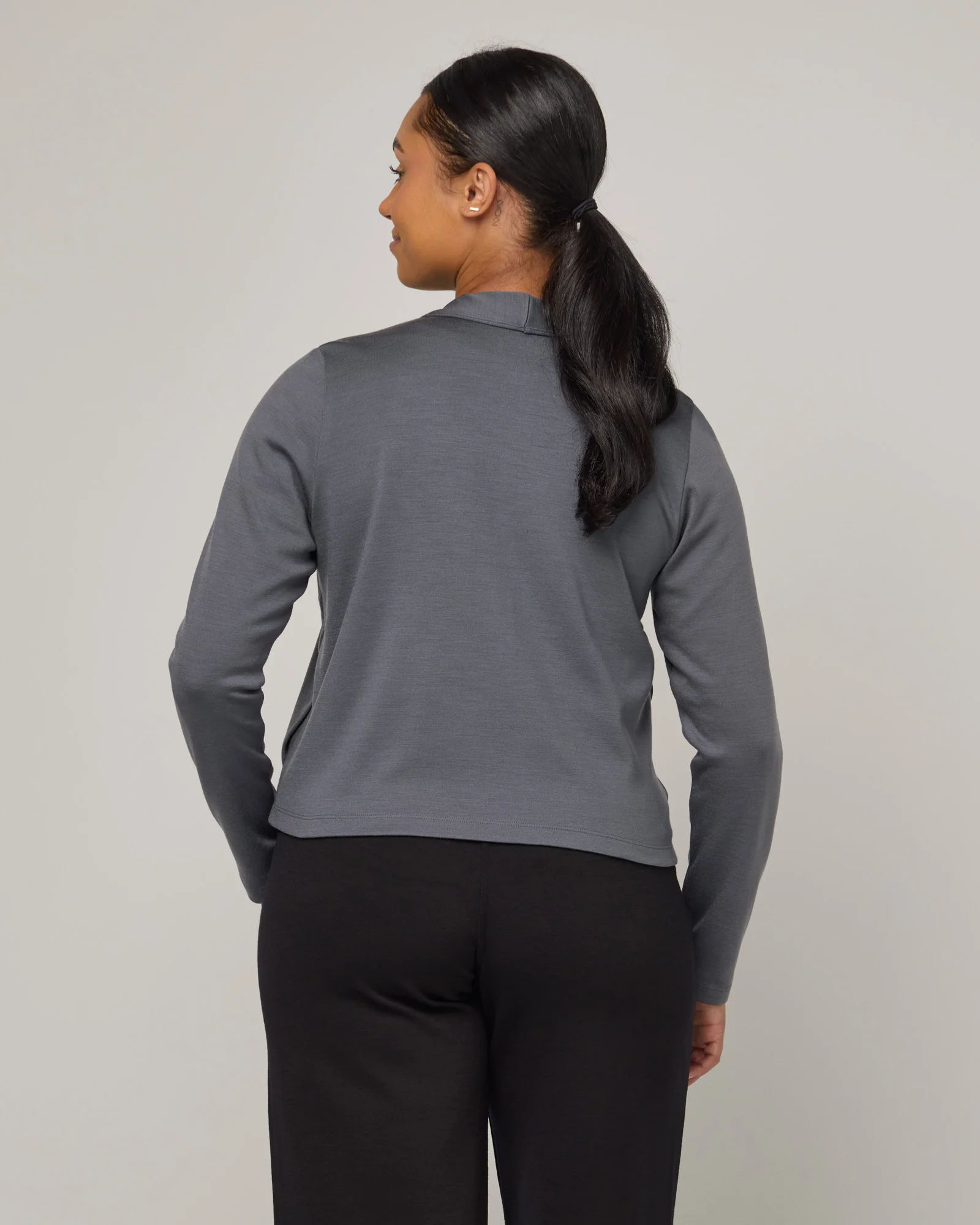 A cropped Cardigan that makes for the perfect layer over dresses. Our interlock fabric feels super soft against the skin. Long sleeve, semi-fitted, and inseam pockets.